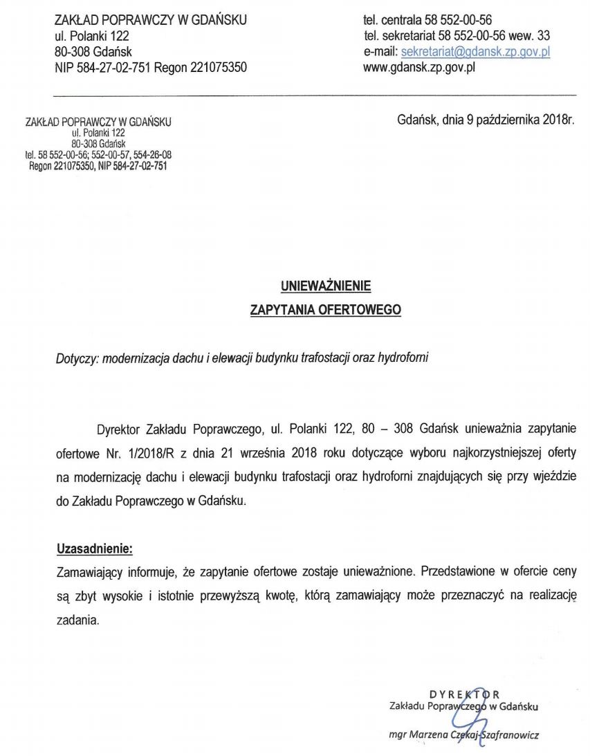 09.10.2018r. - Unieważnienie zapytania ofertowego